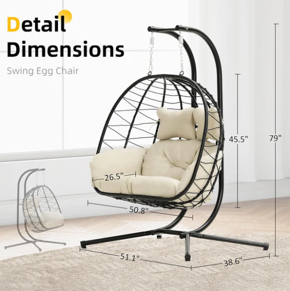 This stylish swing chair offers a safe and comfortable relaxation spot.Featuring a strong hook and upgraded X-shape reinforced steel stand,it ensures durability and stability,. The cushioned seat, with a soft beigecushion and headrest, provides ultimate comfort. Perfect for indoor oroutdoor use, its sleek black frame and sturdy design make it a chicaddition to any space. Relax in style with this reliable piece.