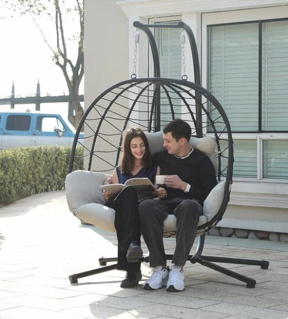 Absolutely love this double egg chair! lt's super comfortable and perfect for our smallbalcony. The foldable design makes it easy to store when not in use, and the cushions aresoft but durable, Highly recommend for anyone looking to relax outdoors."